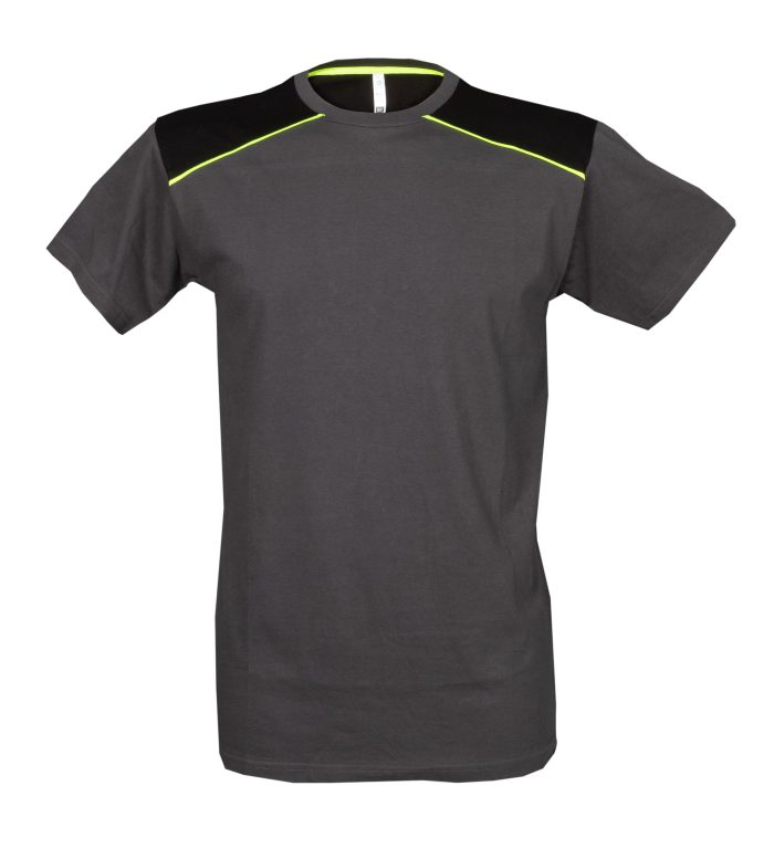 T-shirt manica corta, 100% cotone pettinato, Girocollo, Colletto basso h.cm.1,2, Nasto interno collo in colore giallo fluo, Piping anteriore giallo fluo sulle spalle e posteriore sulla schiena, Protezione ai raggi solari UPF livello 50+(tranne colore WHITE). Disponibile anche nella Tg.XXXL